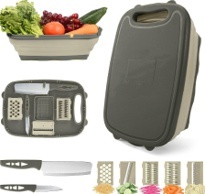 VERSATILE 9-IN-1 PREP KIT - The 9-In-1 Chopping Prep Kit includes a cutting board with a drainer/basket, two knives, and five different cutting blades, offering all the tools you need for efficient meal preparation.