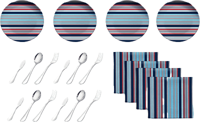 Item Details: Dinnerware set for everyday use, indoors or out; ideal for home, RV or trailer, or camping. Details: 4pcs 11inch dinner plates 4pcs dinner spoon, size: L 8'',18/8 stainless steel 4pcs dinner fork, size: L 8'',18/8 stainless steel 4pcs butter knife, size: 5.7''L, 18/8 stainless steel 4pcs linen napkins, size 18''x18‘’